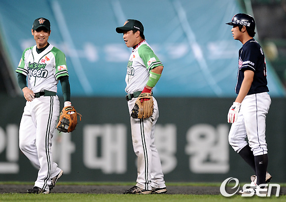 9회초 무사 1루 두산 이성열의 내야땅볼때 SK 정근우가 1루 주자 정수빈을 포스아웃시키고 1루로 송구해 병살아웃시켰다. 최윤석 유격수가 정근우 2루수에게 송구하는 과정에서 약간 위험했던지 최윤석과 정근우가 안도의 웃음을 짓고 있다. /soul1014@osen.co.kr