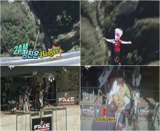 이날 세 사람은 남아공 포트엘리자베스에 위치한 216미터 높이의 세계 최고 번지점프대 위에서 태극기를 휘날리며 용감하게 뛰어내렸다. 유일한 여자 멤버 이영은은 제일 먼저 뛰어내려야 하는 상황을 만나 잠시 머뭇거리기도 했지만 기대 이상으로 야무지게 번지에 성공했다.