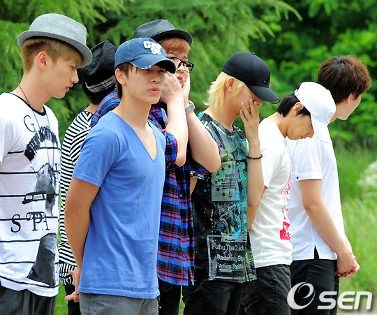 강인을 배웅나온 슈퍼주니어 멤버들이 안타까운듯 고개를 숙이고 있다. /jpnews@osen.co.kr