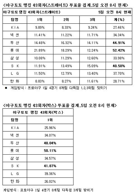 체육진흥투표권 수탁사업자인 오리온그룹 계열의 스포츠토토㈜(www.sportstoto.co.kr)는 6일(화)에 개최되는 두산-KIA, SK-삼성, 한화-LG, 롯데-넥센 등 4경기 8개팀을 대상으로 한 야구토토 랭킹 43회차 스트레이트 게임 중간집계결과 롯데(52.42%), 두산(44.91%), SK(40.50%)를 차례로 다득점 상위 3개팀으로 꼽았다고 밝혔다. 반면 한화와 KIA는 각각 28.71%와 27.46%를 득표해 가장 적은 득점을 기록할 것으로 예상했다.
