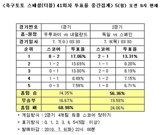 [축구토토] 체육진흥투표권 수탁사업자인 오리온그룹 계열 스포츠토토의 공식 온라인 발매 사이트인 베트맨(www.betman.co.kr)은 2010남아공 월드컵 준결승전 2경기를 대상으로 하는 축구토토 스페셜(더블) 41회차 투표율 중간집계 결과 독일-스페인전에서 축구팬 56.36%가 독일의 승리를 예상했다고 밝혔다.