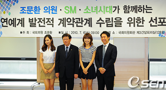 연예계 발전적인 계약관계 수립을 위한 선포식이 6일 오전 국회의원회관에서 열렸다. 이 자리에는 소녀시대와 SM 김영민 대표, 조문환 의원이 참석한 가운데 연예인의 권익을 보호하며 연예인과 엔터테인먼트 회사가 상호 신뢰하고 성장하고자 개최됐다.