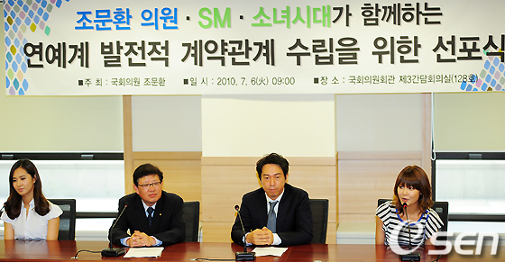 연예계 발전적인 계약관계 수립을 위한 선포식이 6일 오전 국회의원회관에서 열렸다. 이 자리에는 소녀시대와 SM 김영민 대표, 조문환 의원이 참석한 가운데 연예인의 권익을 보호하며 연예인과 엔터테인먼트 회사가 상호 신뢰하고 성장하고자 개최됐다.