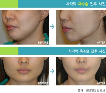 또 다른 원인인 정면효과가 적은 경우에는 최근 V라인 턱성형술이라 하는 삼차원턱성형술로 극복할 수 있으며 정면에서 너무 넓은 경우 피질절골술을 통해서 정면효과를 극대화할 수 있다. 사각턱의 경우 수술 후 근육이 비대해져서 근육이 위축되는 시간까지 약 3-4개월정도 소요되며 근육의 위축이 잘 되지 않는 경우에는 보톡스를 한번정도 맞을 수 있을 것이다.