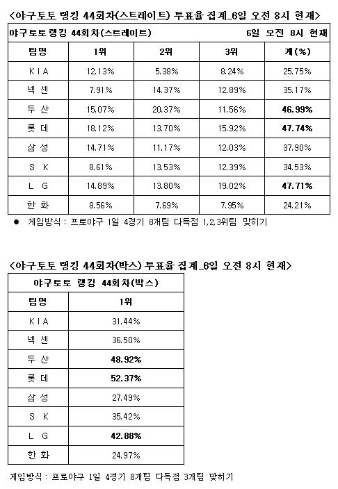 체육진흥투표권 수탁사업자인 오리온그룹 계열의 스포츠토토㈜(www.sportstoto.co.kr)는 7일에 개최되는 두산-KIA, SK-삼성, 한화-LG, 롯데-넥센 등 4경기 8개팀을 대상으로 한 야구토토 랭킹 44회차 스트레이트 게임 중간집계결과 롯데(47.74%), LG(47.71%), 두산(46.99%)을 차례로 다득점 상위 3개팀으로 꼽았다고 밝혔다. 반면 KIA와 한화는 각각 25.75%와 24.21%를 득표해 가장 적은 득점을 기록할 것으로 예상했다.
