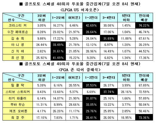 동시에 펼쳐지는 미국프로골프(PGA)투어 '존 디어 클래식' 을 대상으로 한 골프토토 스페셜 49회차에서는 참가자의 73.36%가 국내 프로골퍼의 자존심 '탱크' 최경주의 언더파를 지지했다.