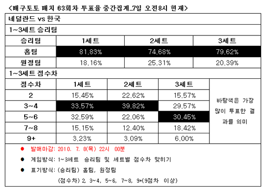 오리온그룹 계열의 체육진흥투표권 수탁사업자 스포츠토토의 공식 온라인 발매사이트인 베트맨(www.betman.co.kr)은 오는 9일(금) 새벽 2시 30분(한국시간) 치러지는 2010월드리그 국제남자배구대회 네덜란드-한국전을 대상으로 한 배구토토 매치 63회차 게임 투표율 중간집계 결과 한국팀의 고전을 예상한 참가자가 많은 것으로 나타났다고 밝혔다.