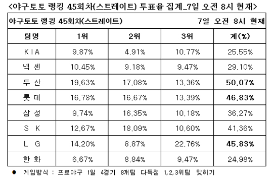 체육진흥투표권 수탁사업자인 오리온그룹 계열의 스포츠토토㈜(www.sportstoto.co.kr)는 8일 개최되는 두산-KIA, SK-삼성, 한화-LG, 롯데-넥센 등 4경기 8개팀을 대상으로 한 야구토토 랭킹 45회차 스트레이트 게임 중간집계결과 두산(50.07%), 롯데(46.83%), LG(45.83%)를 차례로 다득점 상위 3개팀으로 꼽았다고 밝혔다.