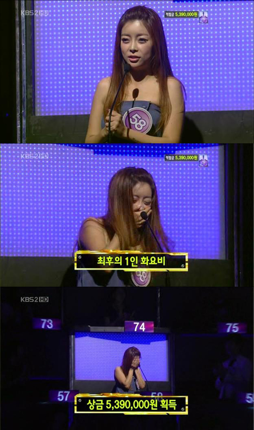 화요비는 6일 방송된 '1대100'에 출연해 발군의 실력을 발휘하며 ‘최후의 1인’ 으로 남아 상금 539만원을 획득했다. 이날 1인으로 도전한 방송인 박정숙은 6단계 에서 아쉽게 탈락 했다. 그러나 화요비는 마지막 문제에서 남은 4인중 유일하게 정답을 지목해 최후의 1인이 되는 영예를 안은 것.