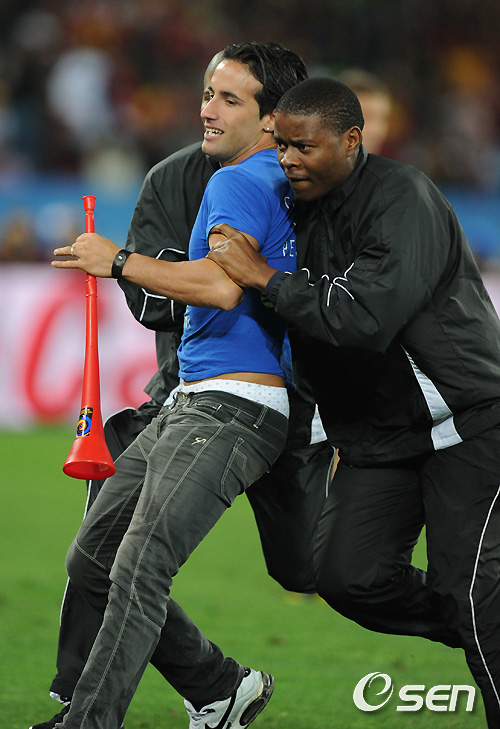전반 한 축구팬이 부부젤라를 들고 경기장에 난입 경기진행요원에게 끌려 나가고 있다. /song@osen.co.kr