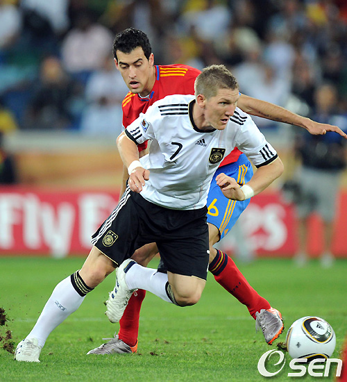 전반 독일의 슈바인슈타이거가 스페인 부스케츠를 돌파하고 있다. /song@osen.co.kr
