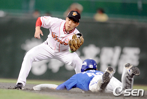 3회초 2사 1루 삼성 박한이의 타석때 SK 정근우가 도루 시도하는 1루 주자 오정복을 2루에서 태그아웃시키고 있다. /soul1014@osen.co.kr