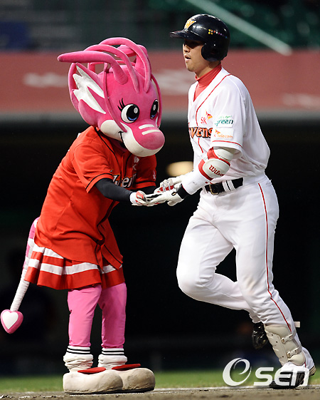 4회말 1사 1,2루 SK 최정이 좌월 3점 홈런을 날리고 SK 와이번스 마스코트와 하이파이브를 하고 있다. /soul1014@osen.co.kr