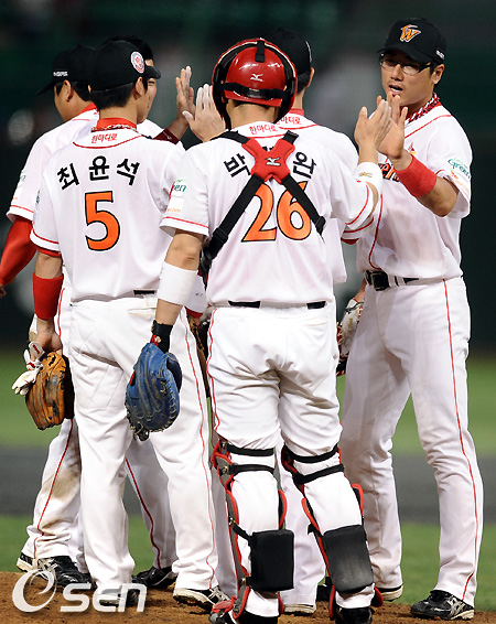 경기 종료후 SK 선수들이 승리의 기쁨을 나누고 있다. /soul1014@osen.co.kr