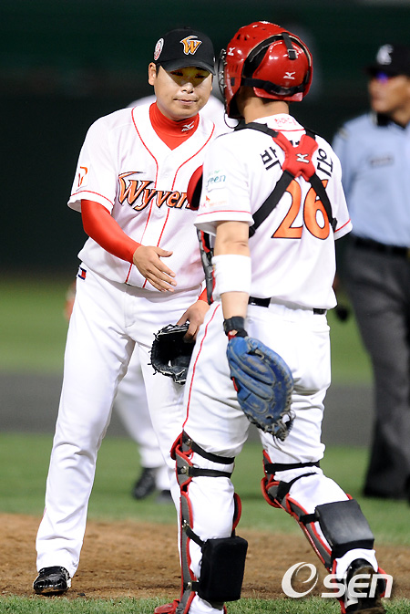 경기 종료후 SK 마무리 이승호 투수와 박경완 포수가 악수를 하고 있다. /soul1014@osen.co.kr
