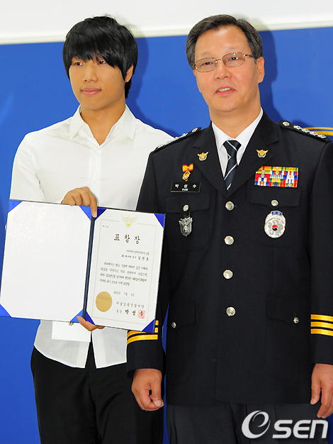 가수 SG워너비의 멤버 김진호가 9일 오전 서울 강동 경찰서에서 중요 범인 검거 유공 표창을 받았다.