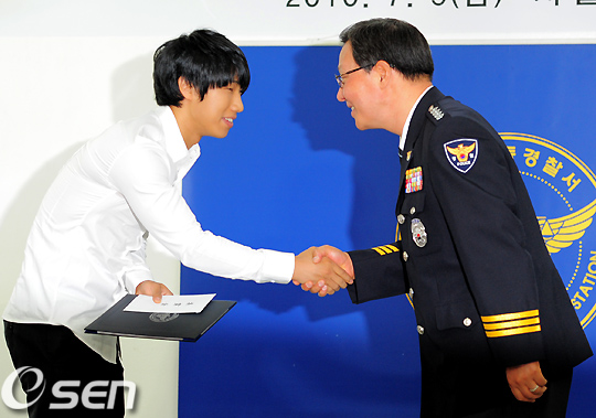 가수 SG워너비의 멤버 김진호가 9일 오전 서울 강동 경찰서에서 중요 범인 검거 유공 표창을 받았다.
