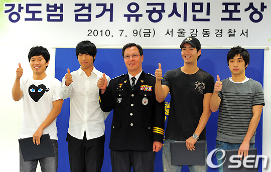 가수 SG워너비의 멤버 김진호가 9일 오전 서울 강동 경찰서에서 중요 범인 검거 유공 표창을 받았다.