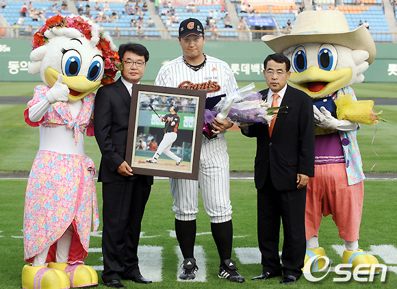 경기 전 통산 1,000루타 달성한 롯데 이대호가 KBO 이상일 총장과 롯데 배재후 단장과 포토타임을 갖고 있다 /soul1014@osen.co.kr