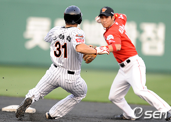 1회초 무사 1,2루 롯데 홍성흔의 내야땅볼때 SK 최윤석이 1루 주자 손아섭을 포스아웃시키고 1루로 송구해 병살아웃 시키고 있다 . /soul1014@osen.co.kr