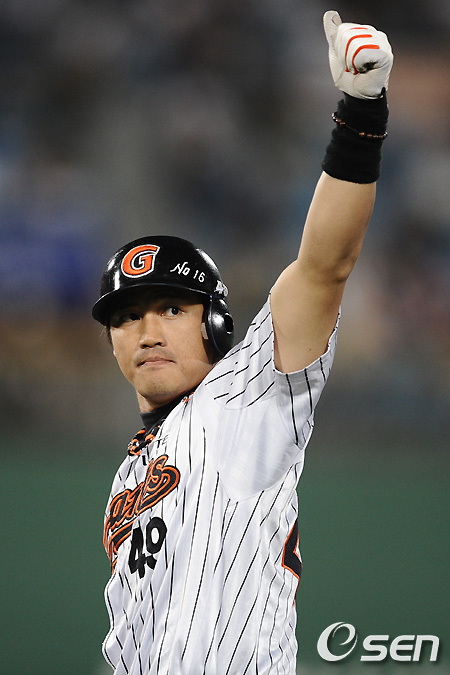 5회말 1사 1,2루 롯데 홍성흔이 좌익수 앞에 떨어지는 동점 1타점 적시타를 날리고 팬들을 향해 손을 들어 보이고 있다. /soul1014@osen.co.kr