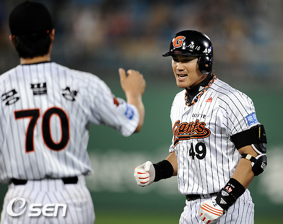 5회말 1사 1,2루 롯데 홍성흔이 좌익수 앞에 떨어지는 동점 1타점 적시타를 날리고 환호하고 있다. /soul1014@osen.co.kr