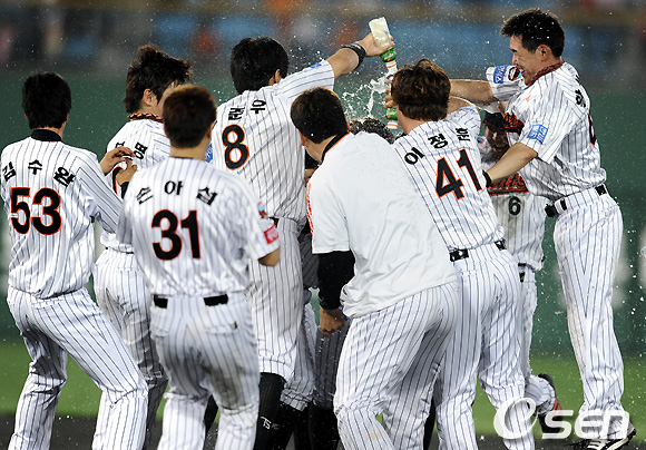 9회말 1사 1,2루 롯데 홍성흔이 끝내기 1타점 적시타를 날린 뒤 동료들의 물 세례 축하를 받고 있다. /soul1014@osen.co.kr