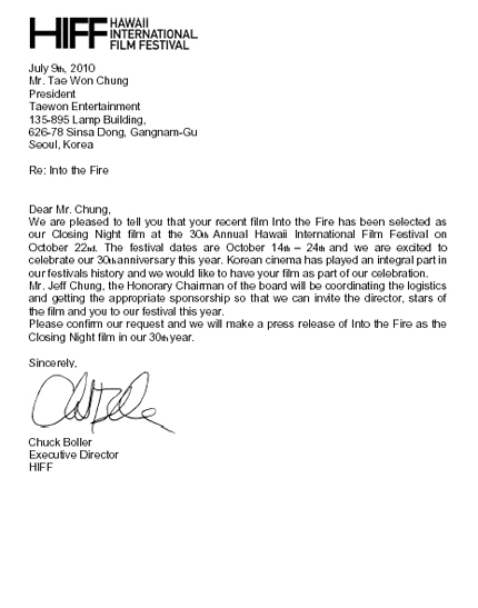 ‘포화속으로’의 아카데미 전망을 더욱 밝게 하는 것은 하와이 국제 영화제의 폐막작 선정이다. ‘포화속으로’는 오늘 9일 영화제 측으로부터 받은 공식 초청장을 공개하며 다시 한번 아카데미 진출을 위한 포부를 밝혔다.