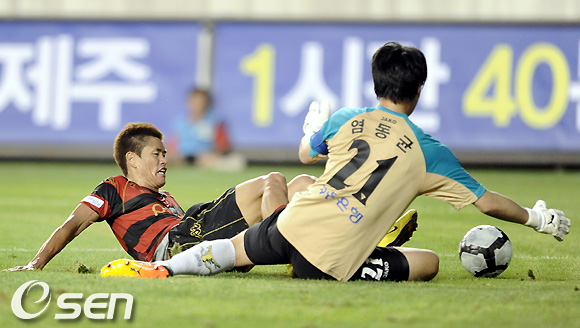전반전 포항 설기현이 전남 염동균 골키퍼의 선방에 막혀 공을 빼앗기고 있다. /soul1014@osen.co.kr