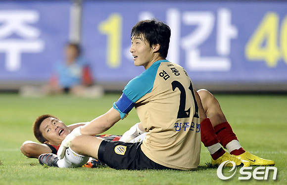 전반전 포항 설기현의 슈팅이 전남 염동훈 골키퍼의 선방에 막히자 아쉬운 표정으로 그라운드에 누워 있다. /soul1014@osen.co.kr