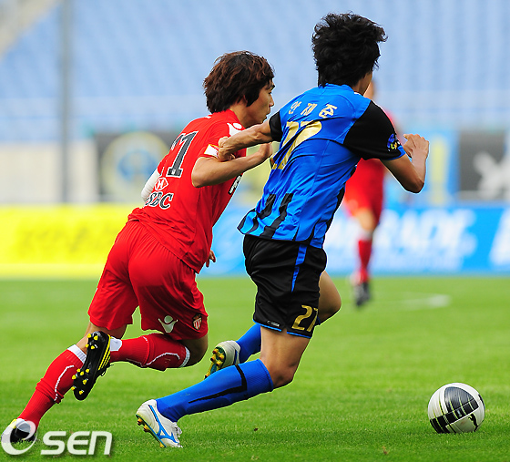 후반 모나코 박주영이 인천 안재준과 치열한 볼다툼을 하고 있다./rumi@osen.co.kr
