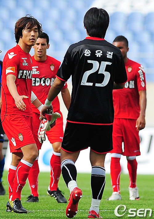 경기를 마치고 모나코 박주영과 인천 송유걸이 악수를 나누려 하고 있다./rumi@osen.co.kr