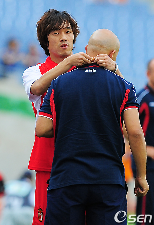 경기를 마치고 모나코 박주영이 경기중 자신의 목걸이를 하고 있던 코치에게 목걸이를 돌려받고 있다./rumi@osen.co.kr
