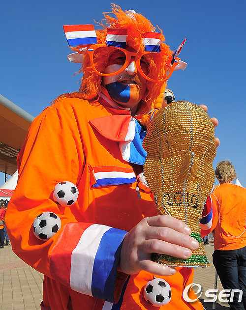 네덜란드 축구팬이 네덜란드의 우승을 기원하며 월드컵을 들어보이고 있다. /song@osen.co.kr