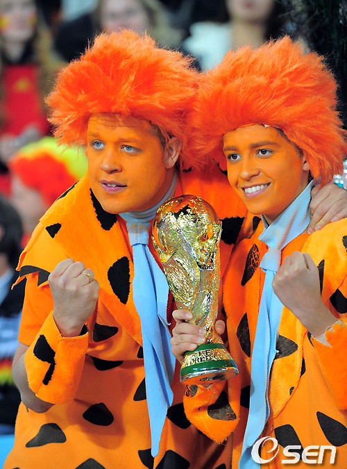 네덜란드 축구팬이 네덜란드의 우승을 기원하며 월드컵을 들어보이고 있다. /song@osen.co.kr