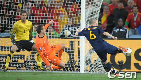 스페인은 연장 후반 4분 네덜란드의 욘 헤이팅아(27, 에버튼)가 경고 누적으로 퇴장을 당하자 수적 우세까지 차지했다. 결국 연장 후반 11분 스페인은 파브레가스가 내준 패스를 안드레스 이니에스타(26, 바르셀로나)가 결승골을 터트리면서 긴 승부에 마침표를 찍었다. 스페인이 80년 숙원이었던 첫 월드컵 우승을 거두는 순간이었다.