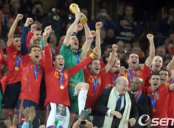 12일(한국시간) 새벽 요하네스버그 사커 시티에서 벌어진 경기서 스페인은 네덜란드와 연장혈투 끝에 연장 후반 이니에스타의 결승골로 1-0으로 승리 월드컵 역사 첫 우승의 감격을 누렸다.