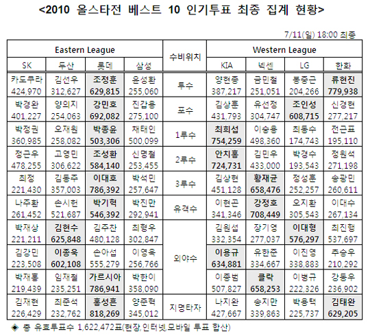 지난 6월 1일부터 7월 11일까지 41일간 전국의 야구장과 인터넷, 모바일을 통해 실시된 베스트10 인기투표는 지난해에 비해 투표 기간이 일주일 가량 줄었다.