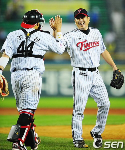 경기를 마치고 LG 마무리 오카모토와 조인성 포수가 하이파이브를 하고 있다./rumi@osen.co.kr