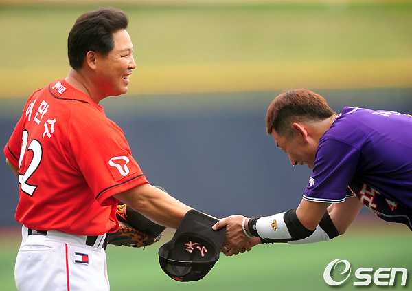 김창렬이 이만수 코치에게 허리숙여 인사를 하고 있다. /spjj@osen.co.kr