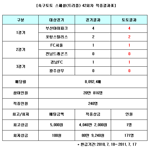 체육진흥투표권 수탁사업자인 오리온 그룹 계열의 스포츠토토(www.sportstoto.co.kr)는 지난 17일 열린 부산-포항, 서울-전남, 경남-광주전 등 K-리그 세 경기를 대상으로 시행한 축구토토 스페셜 42회차 게임에서 세 경기의 최종 점수대를 정확히 맞힌 적중자가 총 240명이 나와 각각 베팅 금액의 8,092.4배에 해당하는 적중상금을 받게 됐다고 밝혔다.