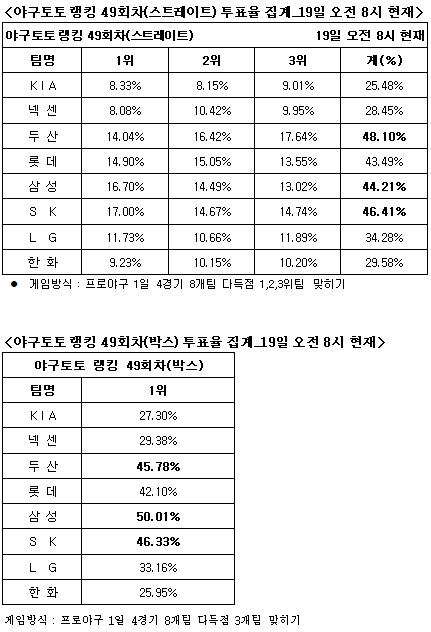 체육진흥투표권 수탁사업자인 오리온그룹 계열의 스포츠토토㈜(www.sportstoto.co.kr)는 오는 20일에 개최되는 두산-LG, 넥센-SK, 한화-롯데, KIA-삼성 등 4경기 8개팀을 대상으로 한 야구토토 랭킹 49회차 스트레이트 게임 중간집계결과 두산(48.10%), SK(46.41%), 삼성(44.21%)을 차례로 다득점 상위 3개팀으로 꼽았다고 밝혔다. 반면 넥센과 KIA는 각각 28.45%와 25.48%를 득표해 가장 적은 득점을 기록할 것으로 예상했다.