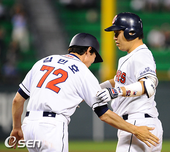 8회말 2사 1,2루 두산 양의지가 좌익수 옆에 떨어지는 역전 1타점 적시타를 날린뒤 김민호 코치의 격려를 받고 있다. /soul1014@osen.co.kr
