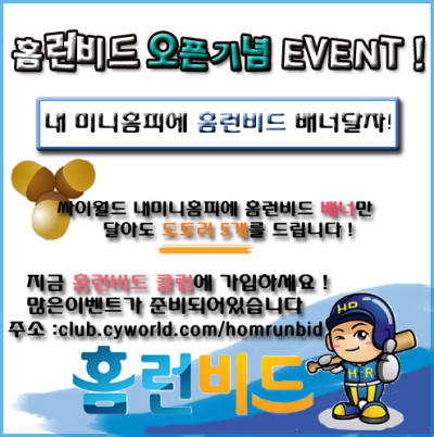 ‘홈런비드’에서는 오픈 후 1달 동안 회원가입 고객에게 사이버 머니인 비드를 3개씩 무료로 지급해주고 있으며, 싸이월드(http://club.cyworld.com/HomeRunBid)에서 ‘홈런비드’ 클럽 회원가입 및 배너 장착 시 도토리 5개씩 지급한다. /이대연 객원기자 osenlife@osen.co.kr