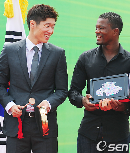 박지성과 에브라가 무대 위에서 기념품을 들고 포토타임을 갖고 있다./rumi@osen.co.kr