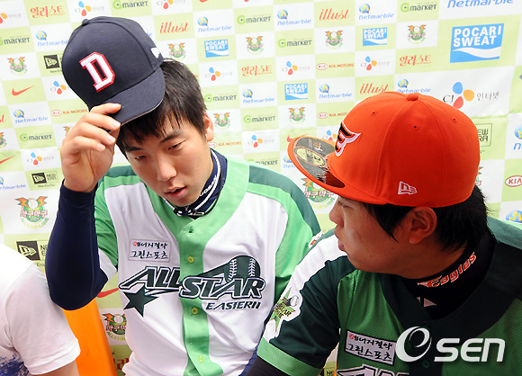 경기전 두산 김현수와 한화 류현진이 마구마구 야구게임을 하며 이야기를 나누고 있다. /soul1014@osen.co.kr