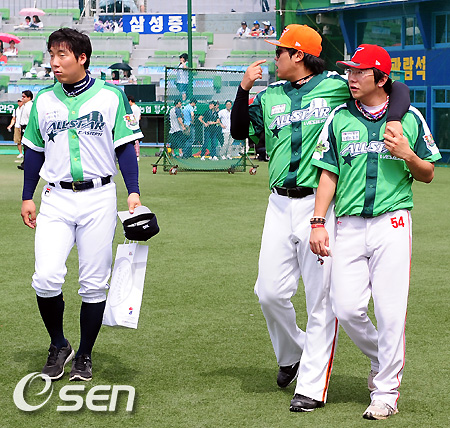 경기전 마구마구 야구게임을 마친 김현수, 류현진, 양현종이 덕아웃으로 걸어가고 있다. /soul1014@osen.co.kr