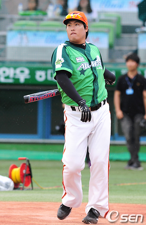 경기 전 벌어진 홈런더비서 투수인 류현진이 참가 홈런을 치고 타구를 바라보고 있다. /spjj@osen.co.kr