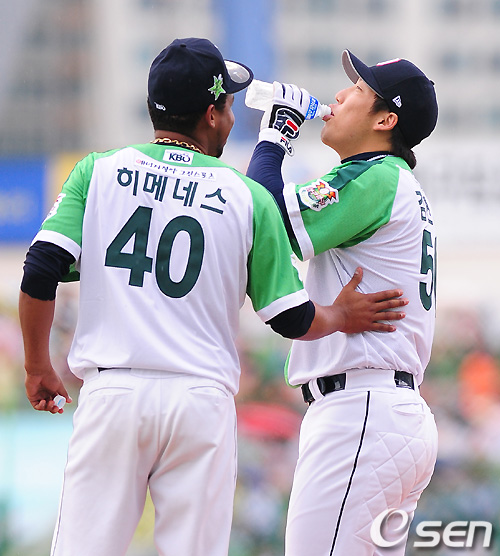 경기 전 벌어진 홈런 더비서 김현수가 홈런을 몰아치자 팀 동료 히메네스가 물을 가져다 주고 있다. /spjj@osen.co.kr