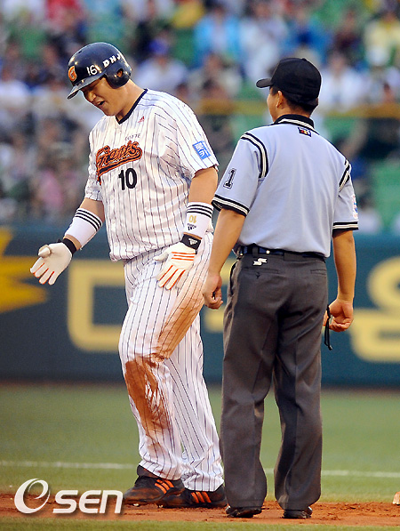 1회말 무사 1루 웨스턴리그 김현수의 타석때 1루 주자 이대호가 2루로 도루 시도했으나 이스턴리그 강정호에게 아웃됐다. 이대호가 박종철 부심에게 어필하고 있다 /soul1014@osen.co.kr